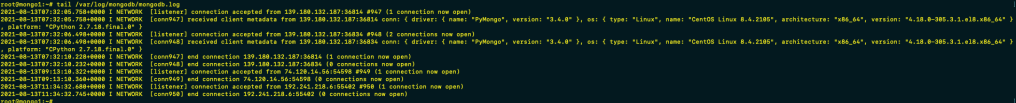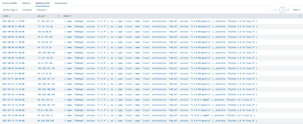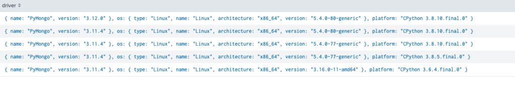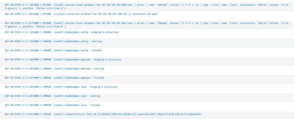 Traffic originated from 185.220.100[.]254 which is a Tor Exit Node in Germany, host with the following driver info – { driver: { name: “PyMongo”, version: “3.11.4” }, os: { type: “Linux”, name: “Linux”, architecture: “x86_64”, version: “5.4.0-77-generic” }, platform: “CPython 3.8.5.final.0” }